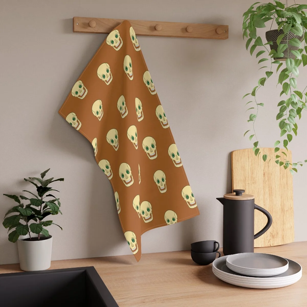 Spooky Skull on Caramel Kitchen Towel