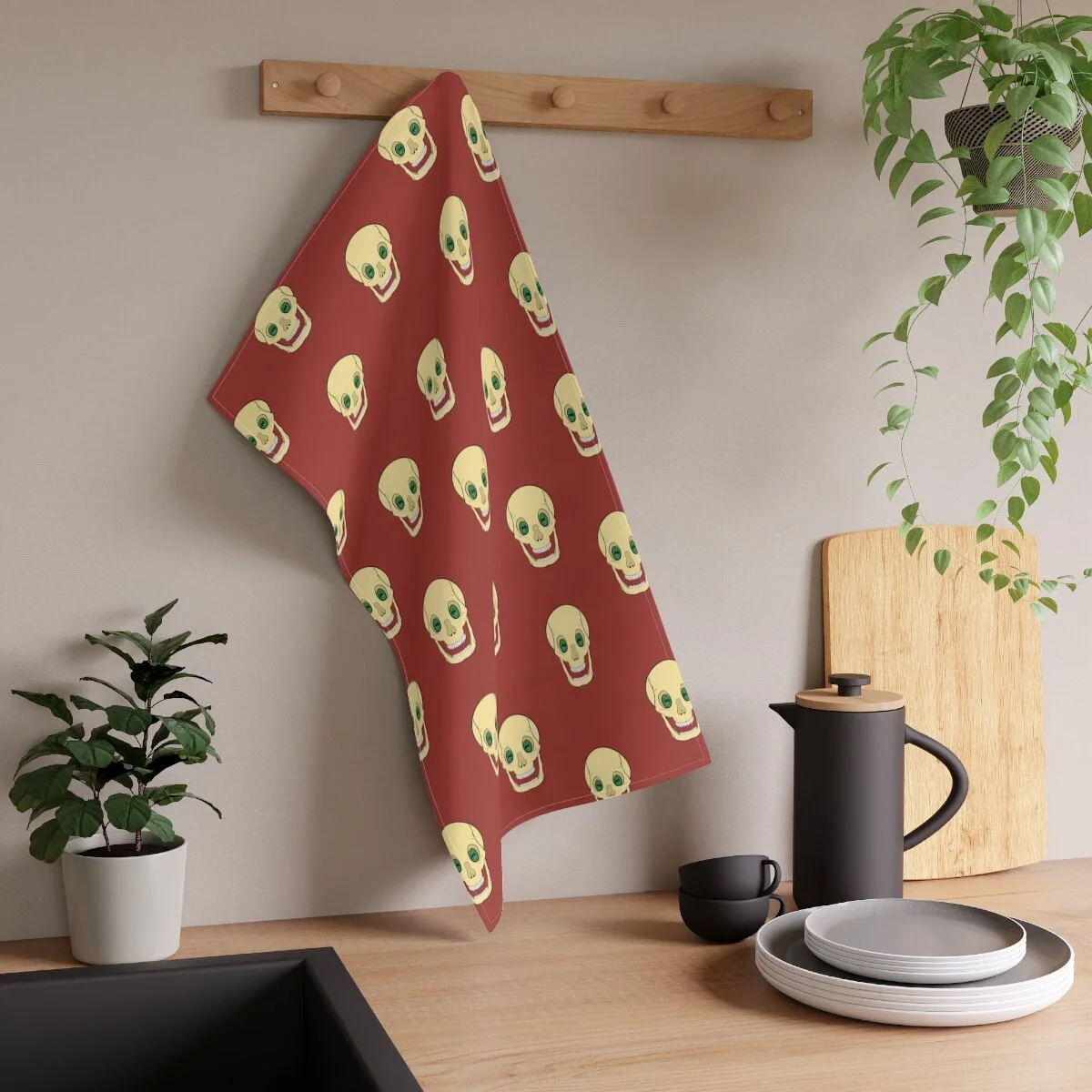 Spooky Skull on Muted Red Kitchen Towel